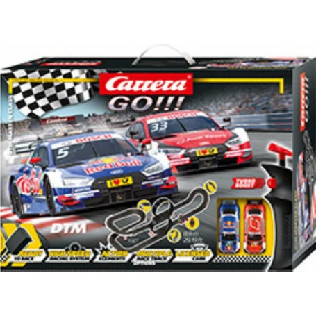A Strong Design Team Sends This Rs 5 DTM Off to Race Audi is a permanent fixture in the German Touring Car Championship and has firmly established itself among racing circles. Behind the wheel of the Audi RS5 DTM super sports car is the experienced racing driver Matthias Ekström. While the Swede often starts from pole position and has already clinched a few victories, René Rast has to fight his way forward from the rear again and again. It is therefore all the more pleasing that he was able to win the championship title in 2017 and the runner-up title in 2018. In 2017, Ekström came in just behind Rast in second place. The Battle for the Title Continues on Your Own Race Track Although Matthias Ekström finished his career in the DTM in 2017, he’s still in for a small race on your Carrera GO!!! race track. The 2 slot cars on a scale of 1:43 look very similar to the originals, thanks to the licenses. On the 8.9-metre-long race track with a scale of 1:43, the 2 Audis can give their best once again. You determine the speed of your slot car with the help of the turbo button on the speed controller. The action-packed race track convinces all with 2 looping sections, a fly-over, and a steep corner. Show off your skills and weave through the chicanes without flying off the track. The set also includes a transformer, a lap counter, and accessories for the track. • Great DTM race track with 2 slot cars • Race track with fly-over, steep corner, lap counter track, and 2 looping sets • Measures 8.9 metres • For 6 years and up.