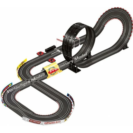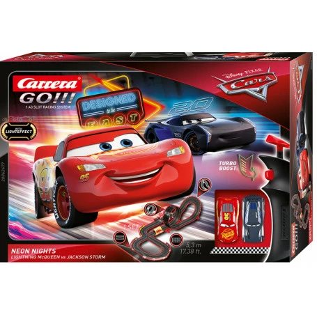 After Sunset Is When Things Really Liven Up Here The darkness doesn’t stop the 2 movie heroes Lightning McQueen and Jackson Storm! With the illumination of their headlights and the brightly lit advertisements to the right and left of the roadway, the 2 racing cars find their way through and battle in another match. With Adrenaline Throughout the Night You can enjoy spectacular races on this Carrera GO!!! race track both during the day and at night. In the dark, however, the cool underglow lighting on these 2 cars comes into its own even more so. On the 5.3-metre-long race track on a scale of 1:43, the 2 opponents don’t give each other an inch. The route takes drivers through a loop, a fly-over, a narrow section, and an intersection. The slot cars on a scale of 1:43 look very similar to the original movie heroes. The set includes the 2 cars and the race track, 2 speed controllers with turbo button, a transformer, the accessories for the track ,and other decorative elements. • Spectacular Carrera GO!!! Racetrack Disney-Pixar Cars Neon Nights with 2 slot cars • Action accessories and decorative elements for great racing fun • 5.3 metres • For 6 years and up.